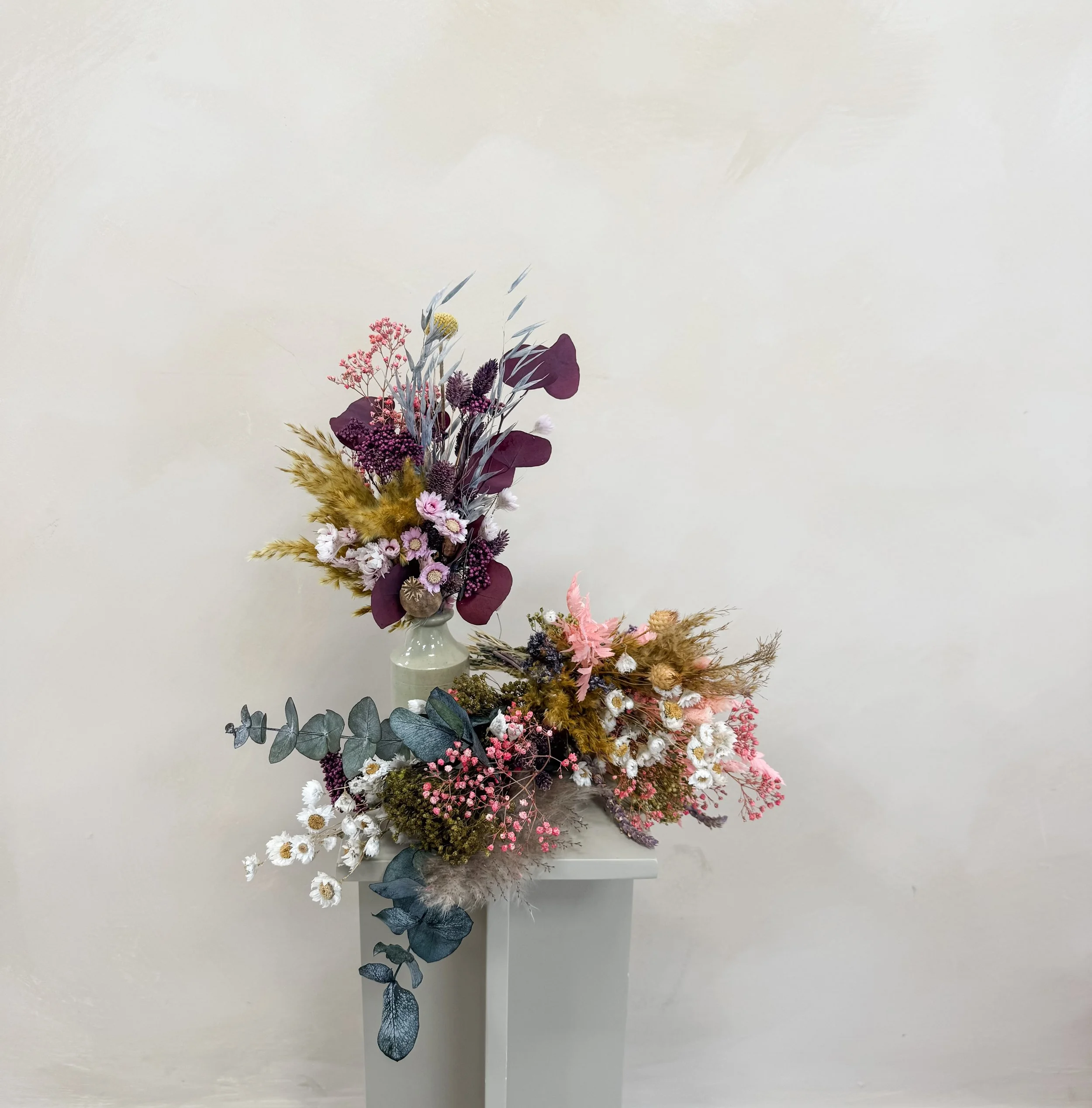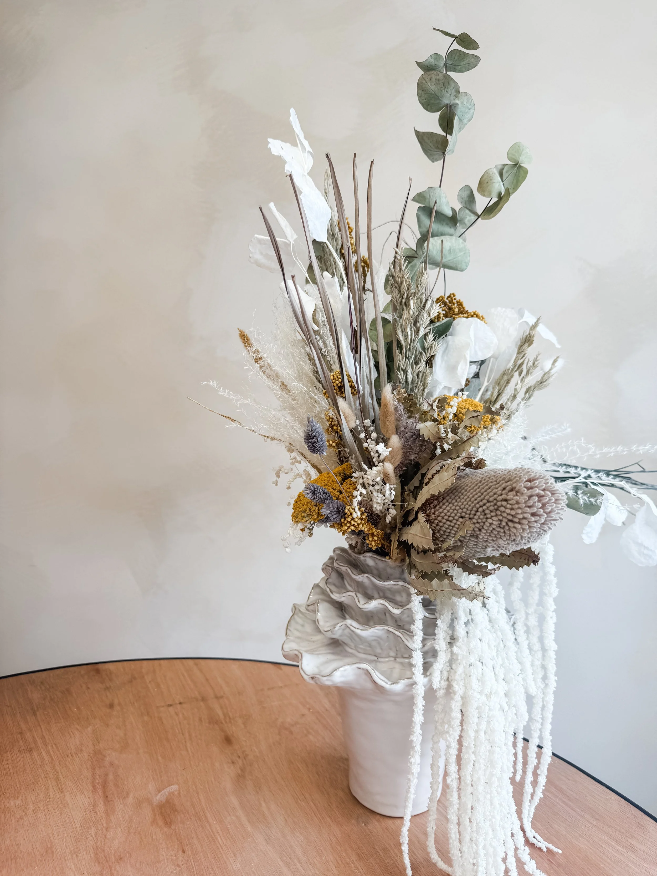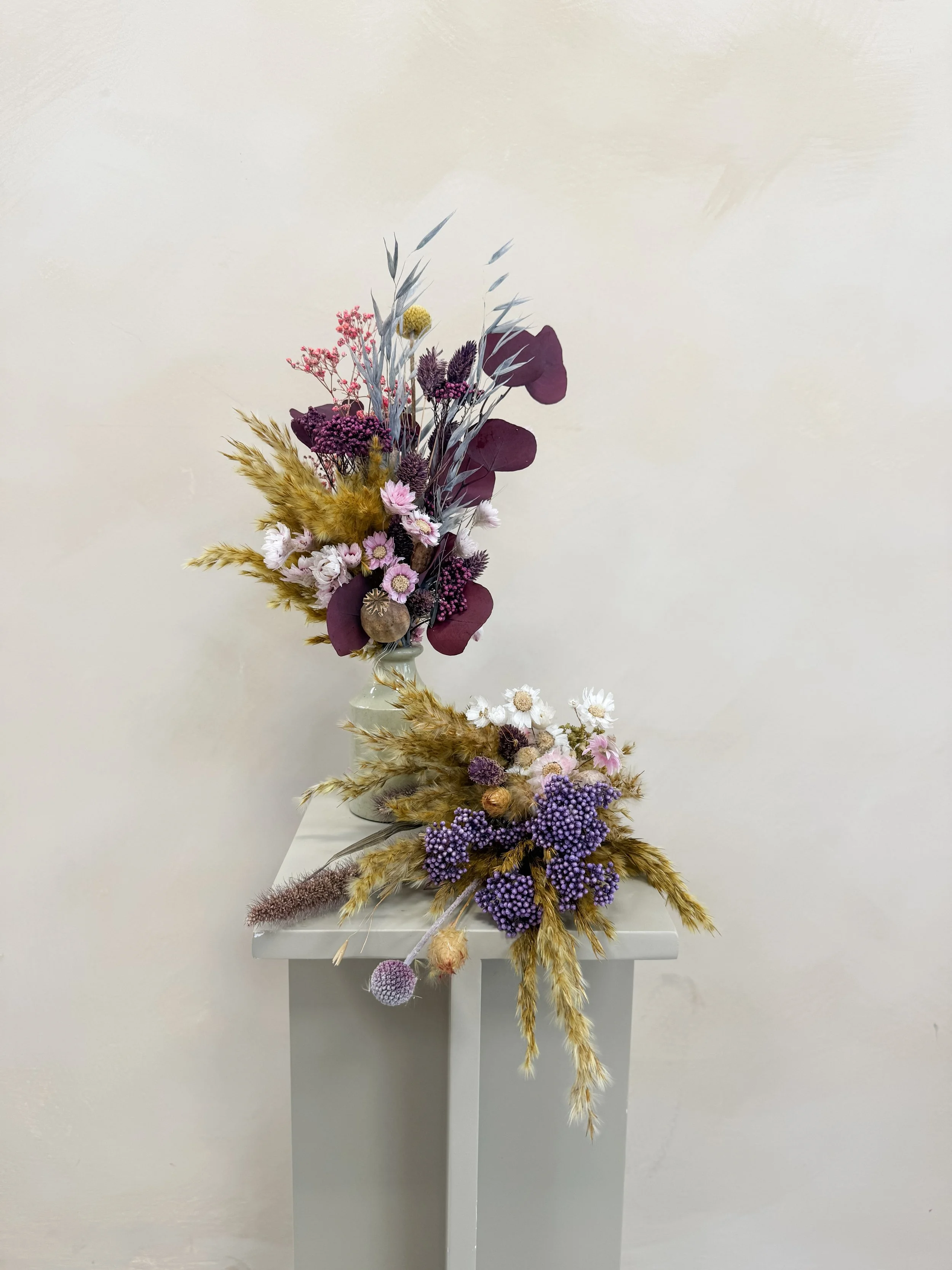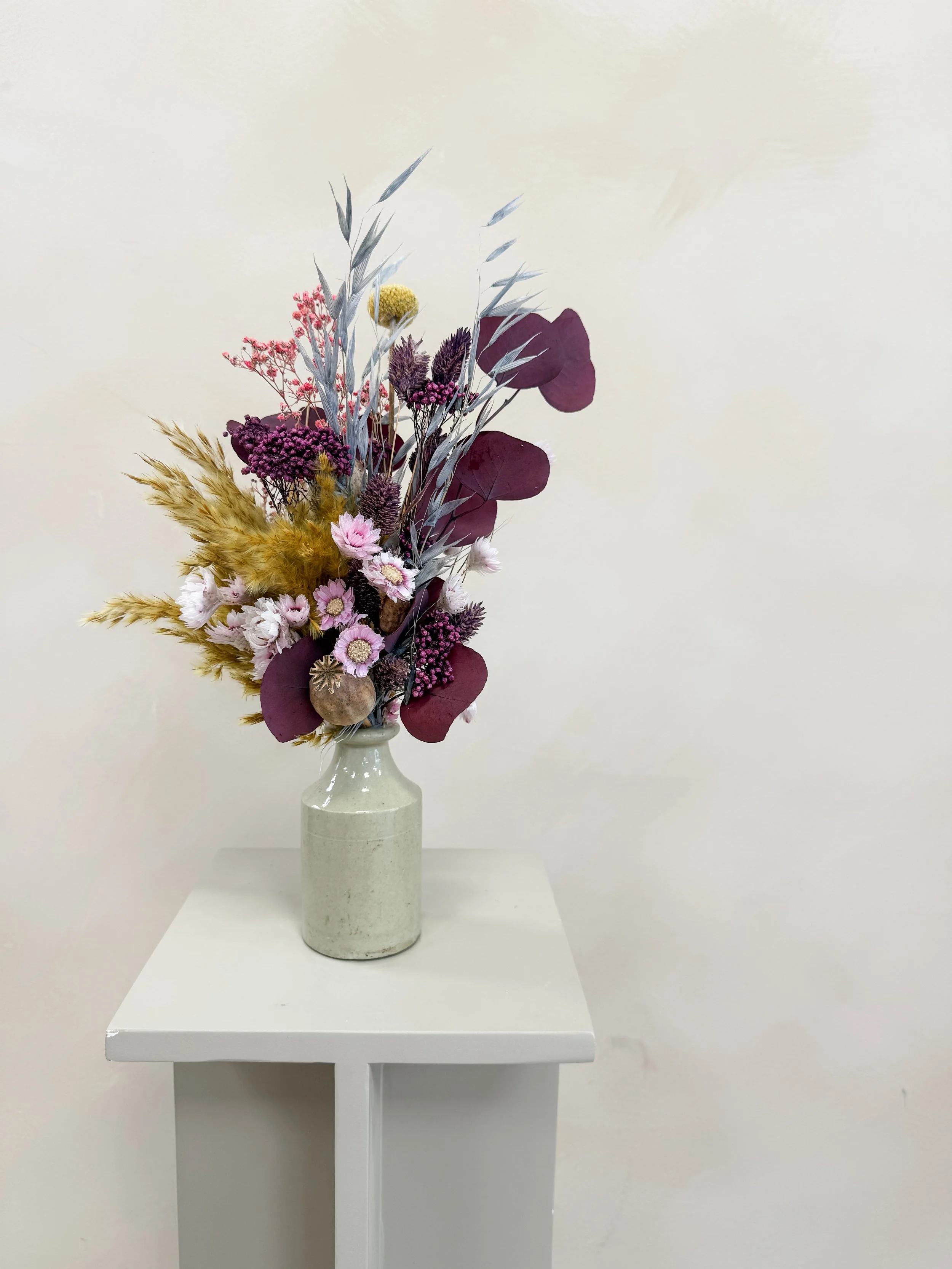 Beautiful dried blooms to suit each season and brighten any space! Perfect size for hall/side tables, desks and other smaller spaces, to fit a vase of approx 15-20cm in size. Each arrangement is hand tied and gift wrapped with a gift tag, also making it ideal for gifting!