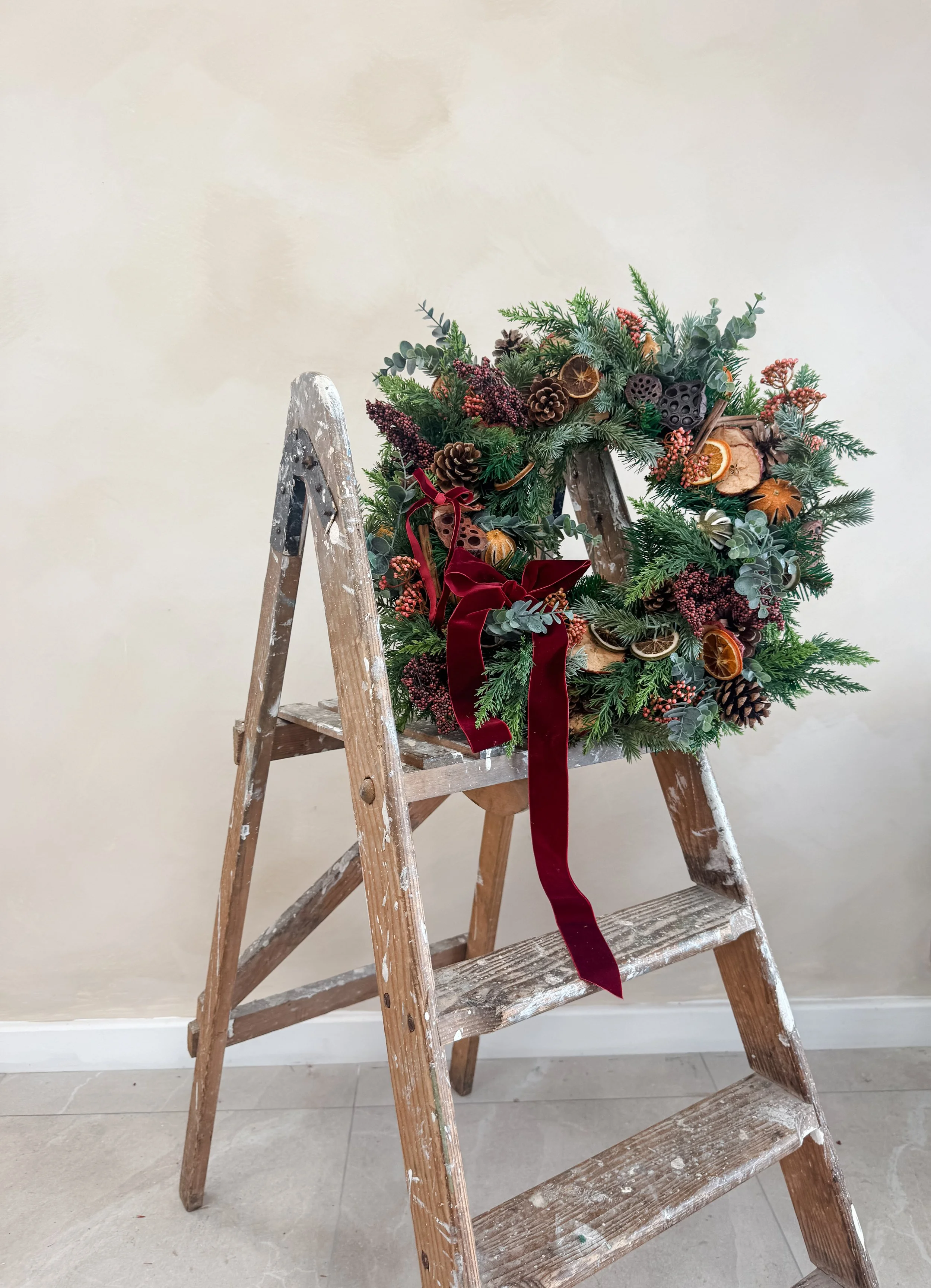 Create a wreath of your very own to reuse year after year, using high quality dried and artificial pieces, learn the skills of wreath making and admire your very own master piece to take home